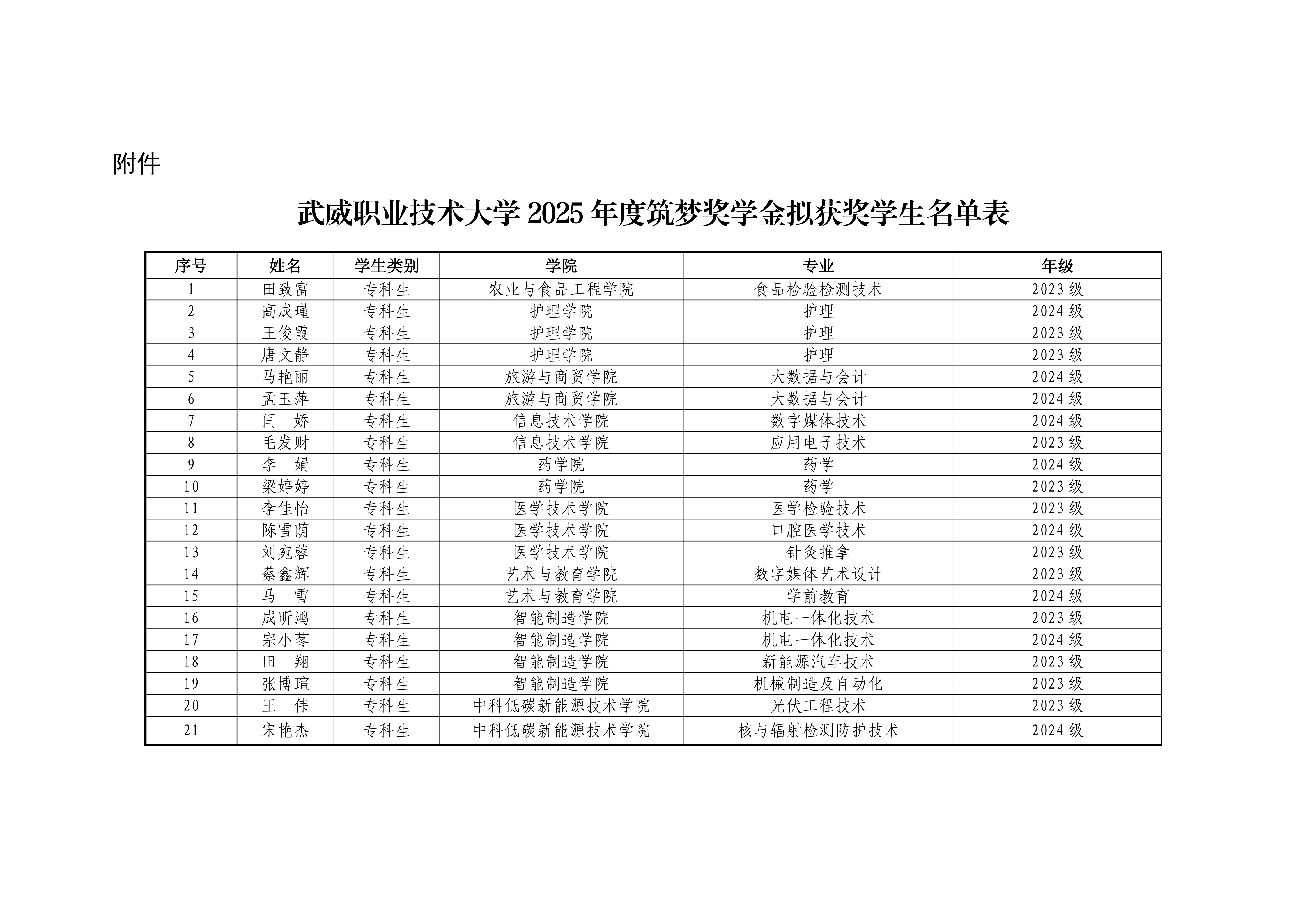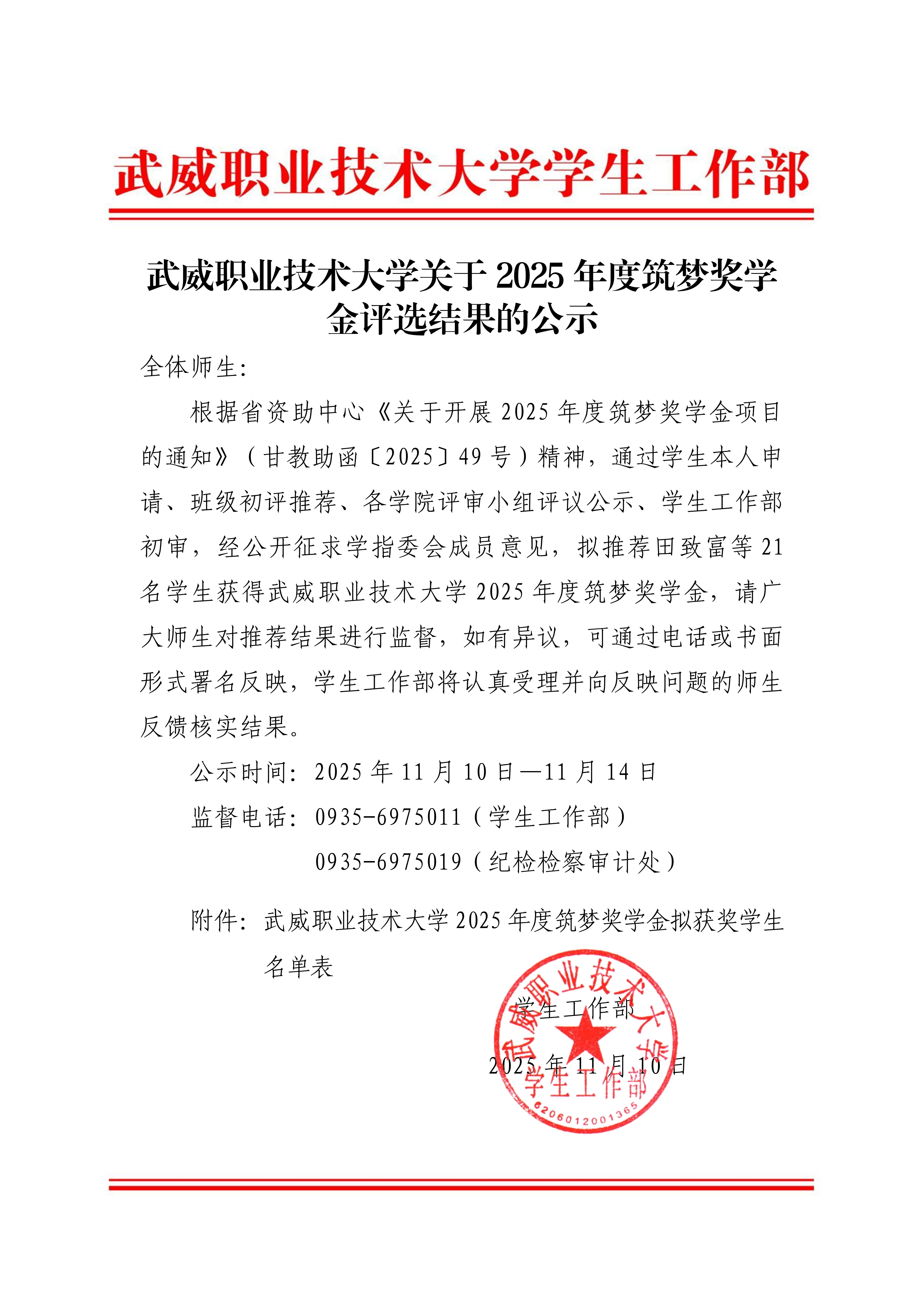 武威職業(yè)技術(shù)大學(xué)關(guān)于2025年度筑夢獎(jiǎng)學(xué)金評選結(jié)果的公示