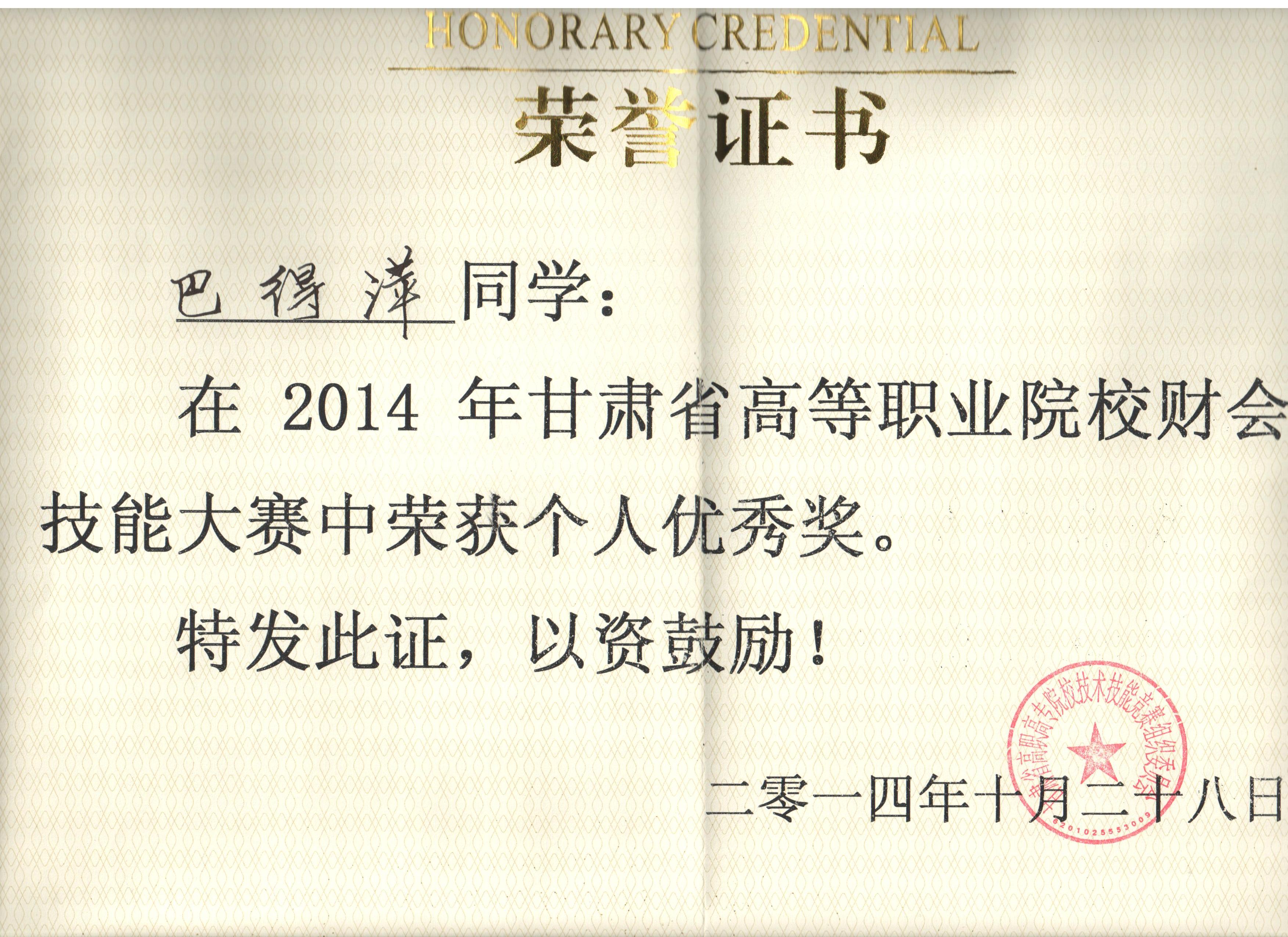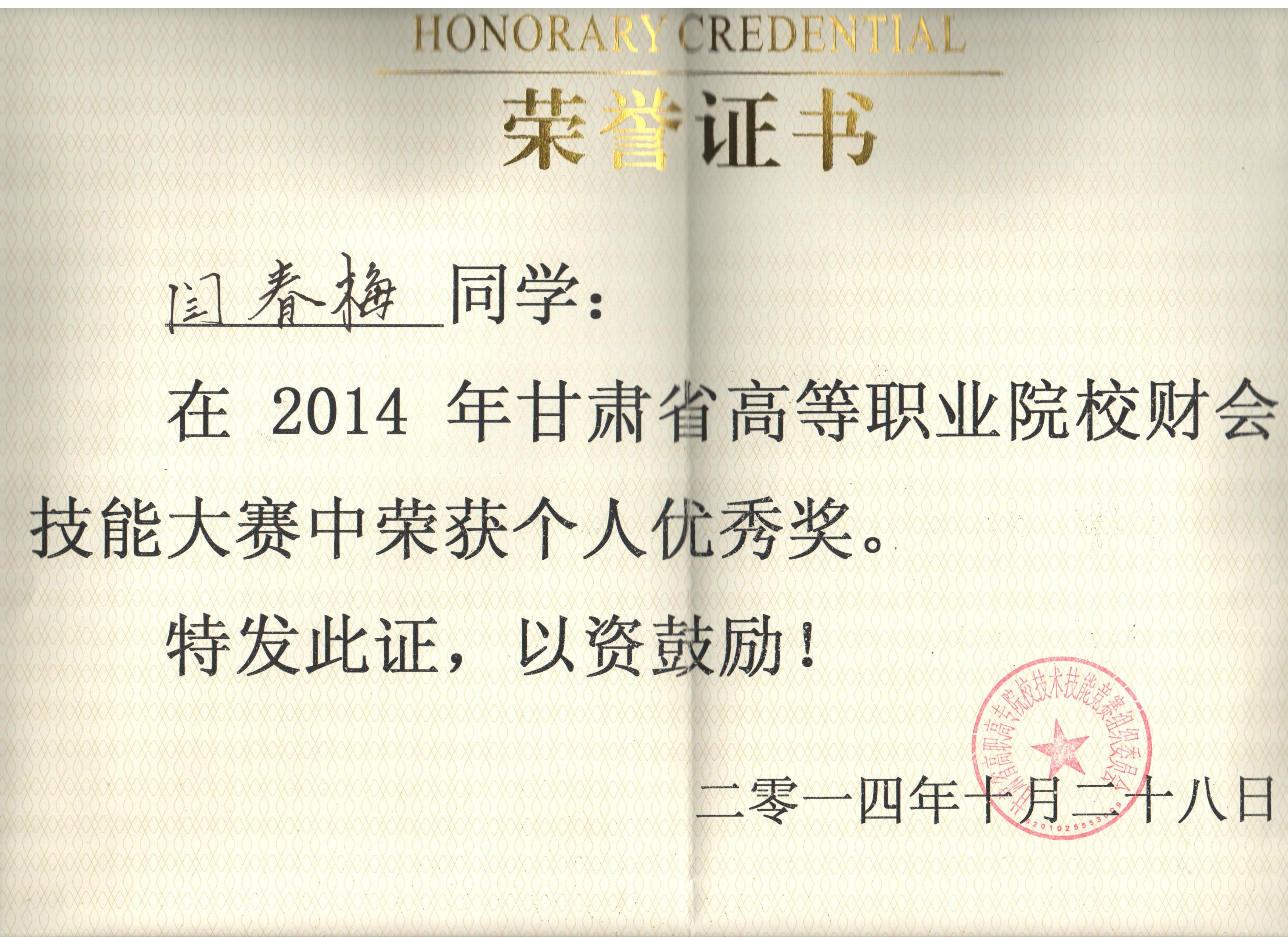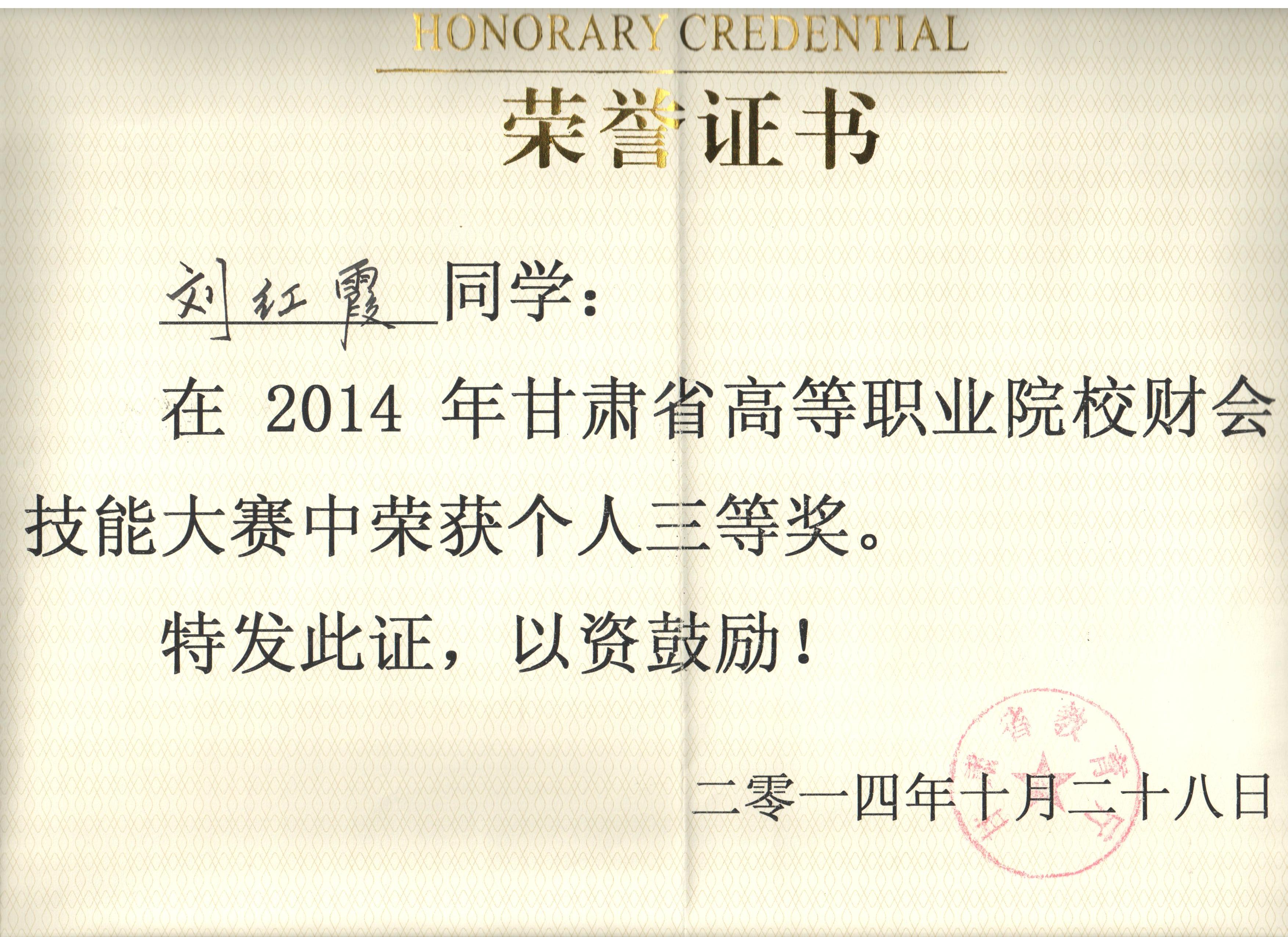 經(jīng)濟管理系李惠蘭、賀德赟老師指導我系會計專業(yè)學生參加2014年甘肅省高等職業(yè)學院財會技能大賽,榮獲優(yōu)秀獎。
