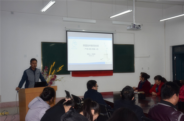 晏素珍就2016年我系教師培訓(xùn)工作做了簡(jiǎn)單回顧與總結(jié),隨后蔡飛從美國(guó)文化入手,介紹了他們?cè)诿绹?guó)加利福尼亞州社區(qū)學(xué)院學(xué)習(xí)的基本情況,分享了實(shí)踐教育教學(xué)的信息、理念、方法、感受。龔建軍從美國(guó)教育體系著手,分享了他在美國(guó)加利福尼亞州社區(qū)學(xué)院參加的“了解美國(guó)現(xiàn)代教育教學(xué)理念,全面提高骨干教師專業(yè)建設(shè)與實(shí)踐能力”培訓(xùn)中的所學(xué)所聞,重點(diǎn)介紹了美國(guó)職業(yè)教育體系和職業(yè)教育教學(xué)及學(xué)習(xí)模式。