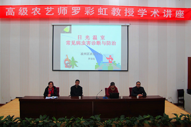 武威市涼州區(qū)農業(yè)技術推廣中心高級農藝師羅彩虹教授結合自身多年工作經驗,做了題為《日光溫室常見病蟲害診斷與防治》的專題講座。講座緊緊圍繞涼州區(qū)日光溫室常見侵染性病害、植物生理病害、常見蟲害的癥狀識別,做了非常到位的講解。同時也針對不同的病蟲害提出了相應的富有成效的綜合防治措施。