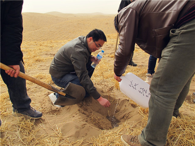 到達治沙造林現(xiàn)場后,師生按照劃分好的區(qū)域,帶上塑料桶,拿上土鉆,馬上投入到了緊張的勞動中。在現(xiàn)場技術(shù)人員的指導(dǎo)下挖坑、栽種樹苗、澆水,完成了預(yù)定的治沙造林任務(wù)。