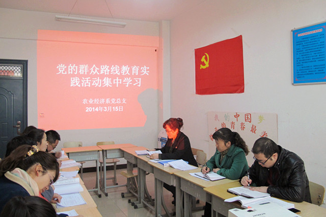 14年3月15日,農(nóng)業(yè)經(jīng)濟系組織全體黨員及教師進行了黨的群眾路線教育實踐活動集中學(xué)習(xí)。依據(jù)學(xué)習(xí)安排主要對《黨的群眾路線教育實踐活動學(xué)習(xí)文件選編》、《厲行節(jié)約、反對浪費----重要論述摘編》、《論群眾路線----重要論述摘編》等內(nèi)容進行了學(xué)習(xí)。