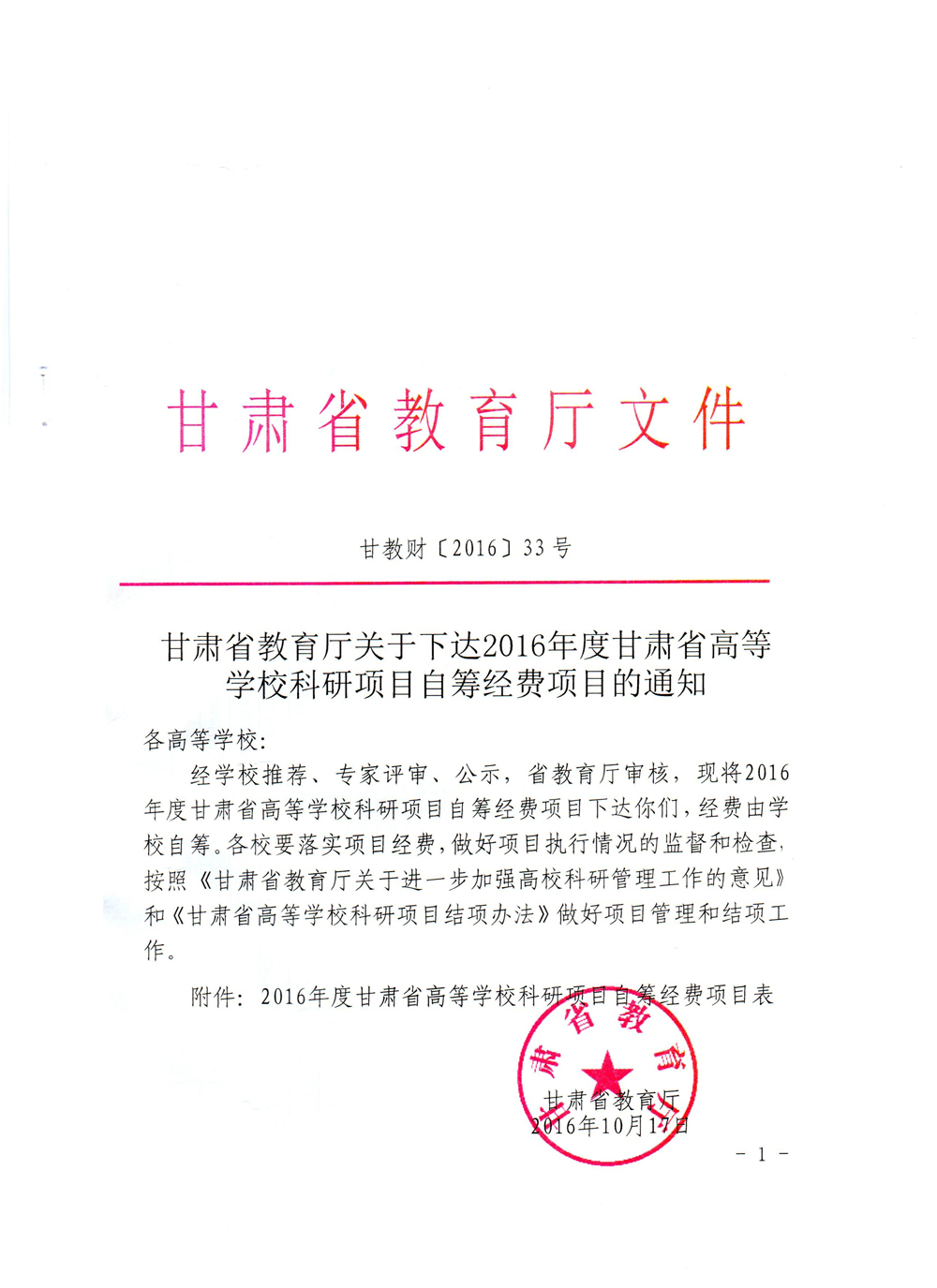 轉(zhuǎn)發(fā)甘肅省財政廳 教育廳文件 關(guān)于下達2016年度甘肅省高等學(xué)??蒲许椖孔曰I經(jīng)費項目的通知