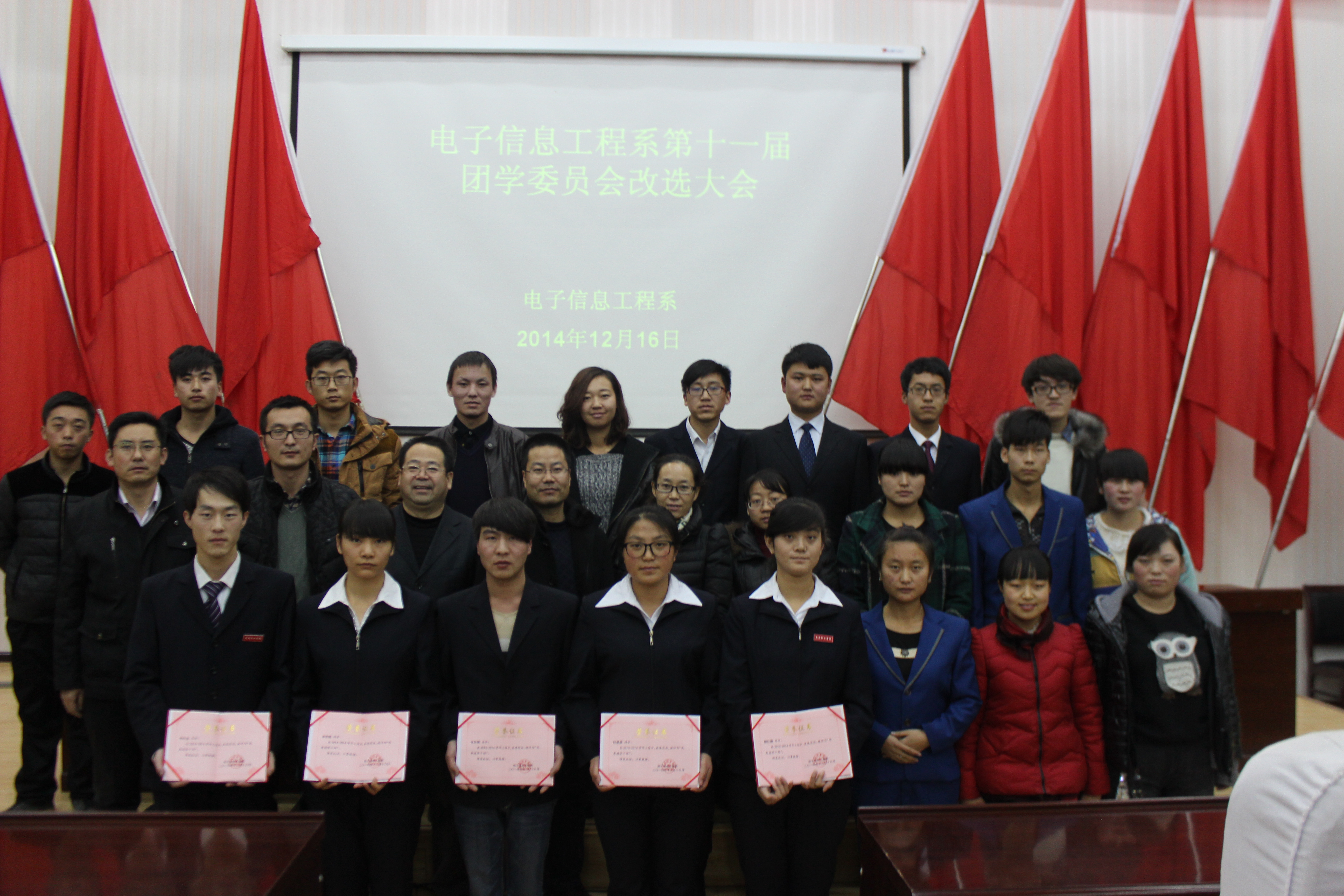 系主任白玉珍對我系團(tuán)學(xué)工作給予了高度的評價,對上一屆團(tuán)總支學(xué)生會優(yōu)秀學(xué)生干部進(jìn)行了表彰并頒發(fā)了榮譽(yù)證書。最后系書記張伯成致閉幕詞,認(rèn)為我系團(tuán)學(xué)工作緊密圍繞學(xué)風(fēng)建設(shè)這一中心,著力推進(jìn)對學(xué)生的各項服務(wù),開展了一系列富有特色的活動,取得了良好的成效。他還對我系的團(tuán)學(xué)工作提出了新的要求,希望新一屆團(tuán)學(xué)干部做到加強(qiáng)政治理論學(xué)習(xí),做好模范帶頭作用,克服困難,團(tuán)結(jié)一致,服務(wù)好全系學(xué)生,為實現(xiàn)電子信息工程系學(xué)生工作新的跨越努力。