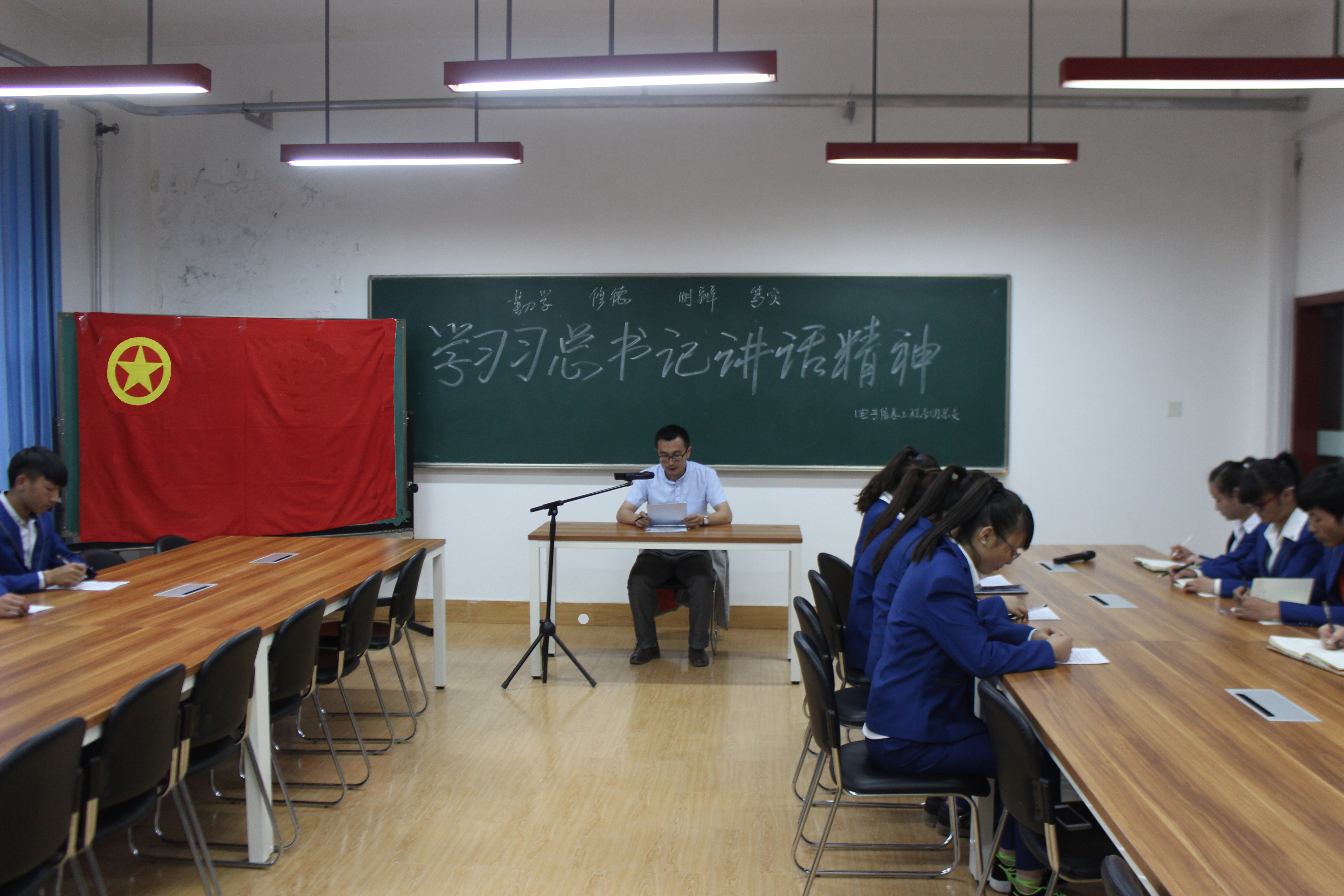為使學(xué)生更好地學(xué)習(xí)和踐行習(xí)近平總書記的系列講話精神,牢固同學(xué)們對(duì)黨的科學(xué)理論的信仰,電子信息工程系團(tuán)總支于2015年5月5日在尚德樓5樓計(jì)算機(jī)教研室開展學(xué)習(xí)習(xí)近平總書記講話精神“四進(jìn)四信”活動(dòng)暨“如何練好習(xí)大大傳授的‘八字真經(jīng)’”主題團(tuán)日活動(dòng),活動(dòng)由電子信息工程系團(tuán)總支書記唐宗舜老師主持,各班團(tuán)學(xué)干部參加活動(dòng)。