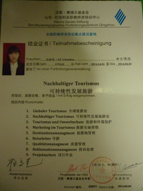 2014年3月24日至4月4日,我院旅游管理專業(yè)骨干教師馬靜、許春華參加了德國(guó)漢斯·賽德爾基金會(huì)(Hanns Seidel Stiftung)在酒泉職業(yè)技術(shù)學(xué)院舉辦的“可持續(xù)性發(fā)展旅游”師資培訓(xùn)班。