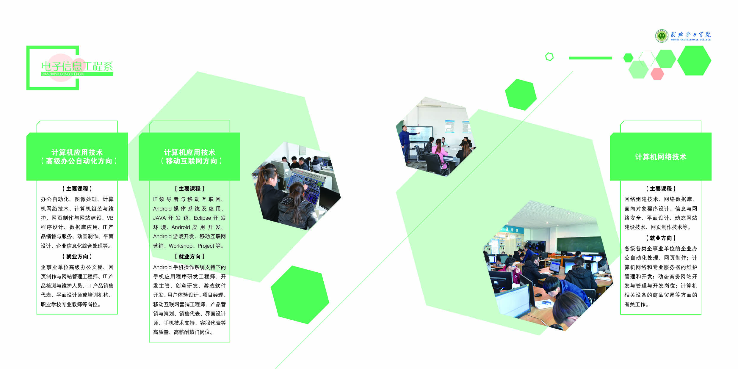 主要課程:辦公自動(dòng)化、圖像處理、計(jì)算機(jī)網(wǎng)絡(luò)技術(shù)、計(jì)算機(jī)組裝與維護(hù)、網(wǎng)頁(yè)制作與網(wǎng)站建設(shè)、VB程序設(shè)計(jì)、數(shù)據(jù)庫(kù)應(yīng)用、IT產(chǎn)品銷售與服務(wù)、動(dòng)畫制作、平面設(shè)計(jì)、企業(yè)信息化綜合處理等。