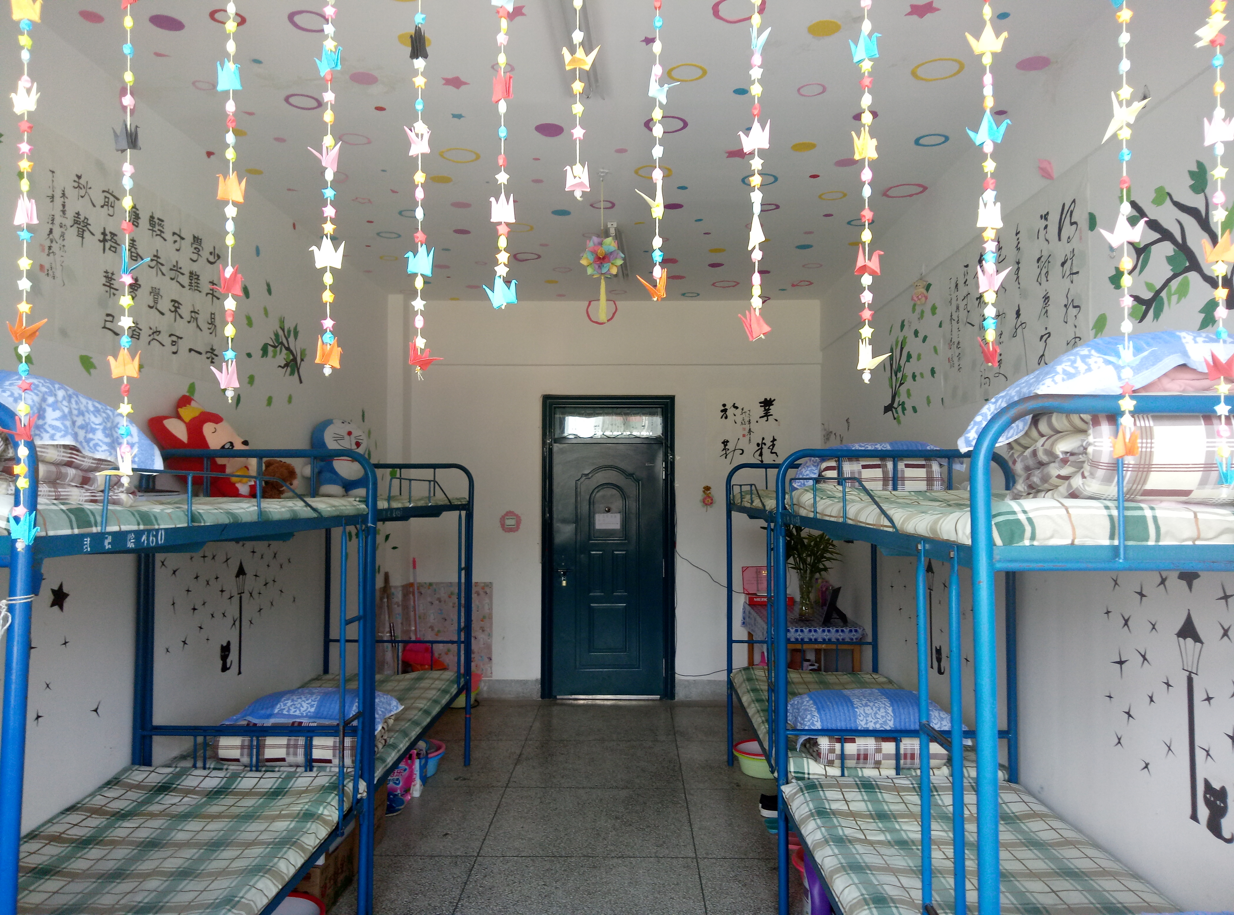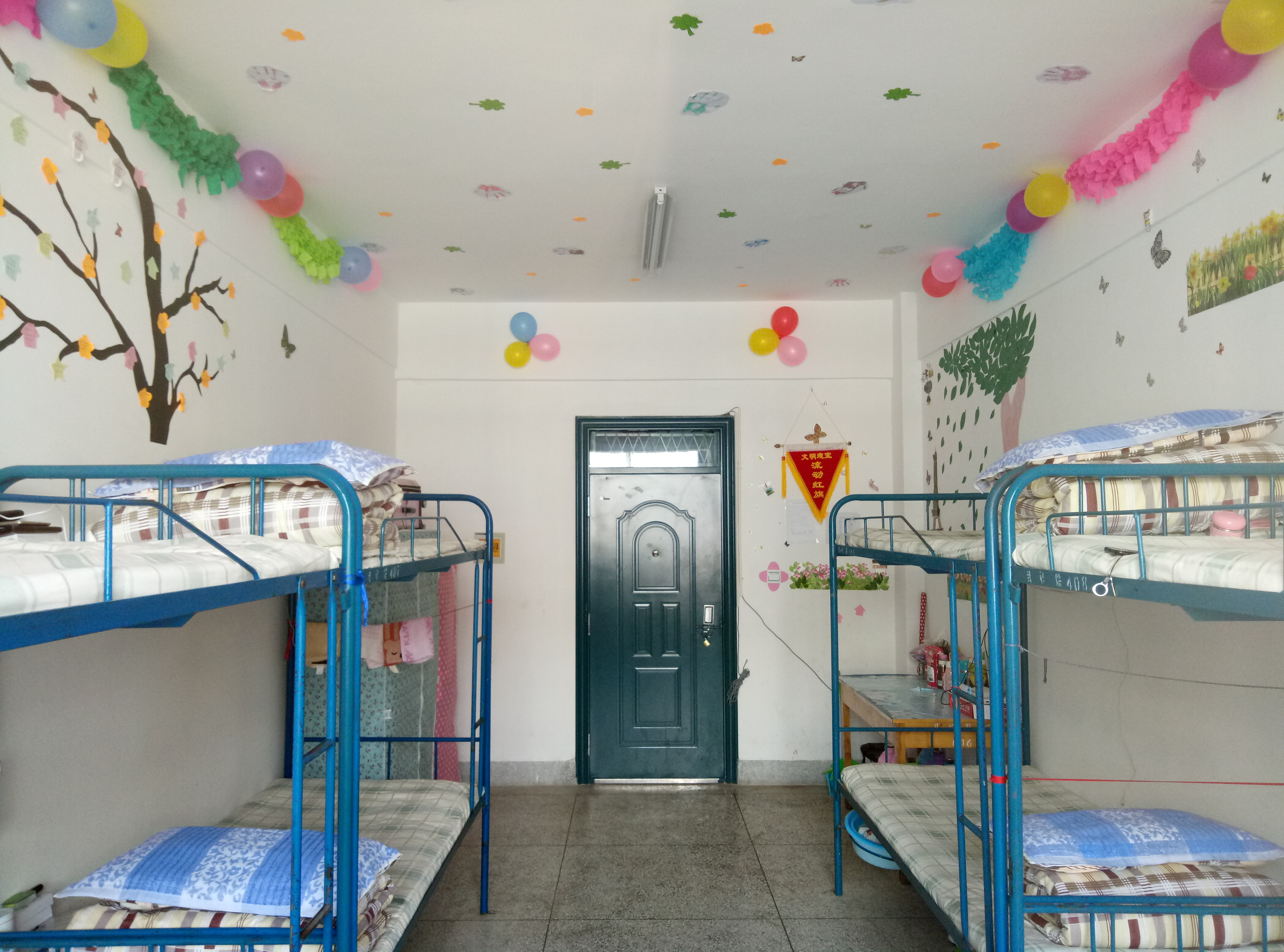 各宿舍衛(wèi)生狀況普遍較好,基本做到了勤開窗,勤掃除,被褥疊放整齊,地面、桌面干凈整潔,用電合理、安全。同學們大膽創(chuàng)新利用剪紙、剪花、圖貼等手工作品將宿舍裝扮得優(yōu)雅而漂亮。也有同學用書法、繪畫作品裝扮宿舍,為宿舍增添了藝術的氣息。
