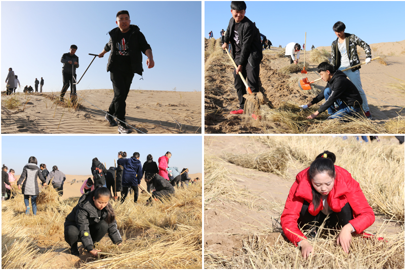 在勞動現(xiàn)場,學(xué)院領(lǐng)導(dǎo)和師生們不畏冬寒,分工協(xié)作,按照標(biāo)準(zhǔn)和要求劃線開溝、蒲草培沙、等距離推進(jìn),現(xiàn)場一片熱火朝天的景象?;氖彽纳车厣砼乱?,整齊的稻草方格逐漸向遠(yuǎn)處的沙丘覆蓋。