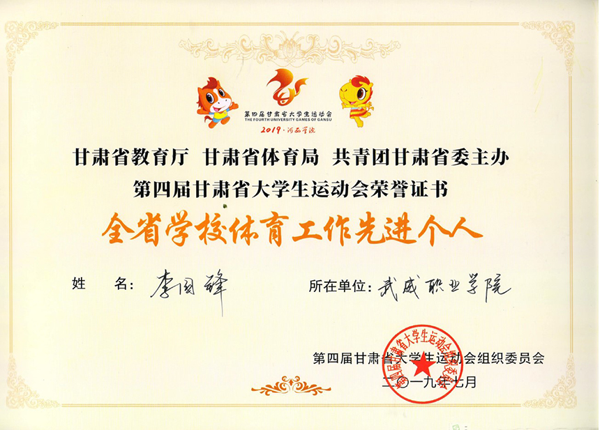 甘肅省教育廳甘肅省體育局共青團(tuán)甘肅省委主辦第四屆甘肅省大學(xué)生運(yùn)動會被評為“全省學(xué)校體育工作先進(jìn)個人”